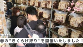 2026年3月28日(土)春のきくらげ狩りイベント開催レポート 2026年3月28日(土)、最高気温は22度まで上がり、すっかり春のぽかぽか陽気! 前回に引き続き、今回も気持ちのいいお天気に恵まれる中、きくらげ狩りイベントを開催いたしました。 当日はたくさんの方にお越しいただき、本当にありがとうござ... 2026.04.03 イベントレポート